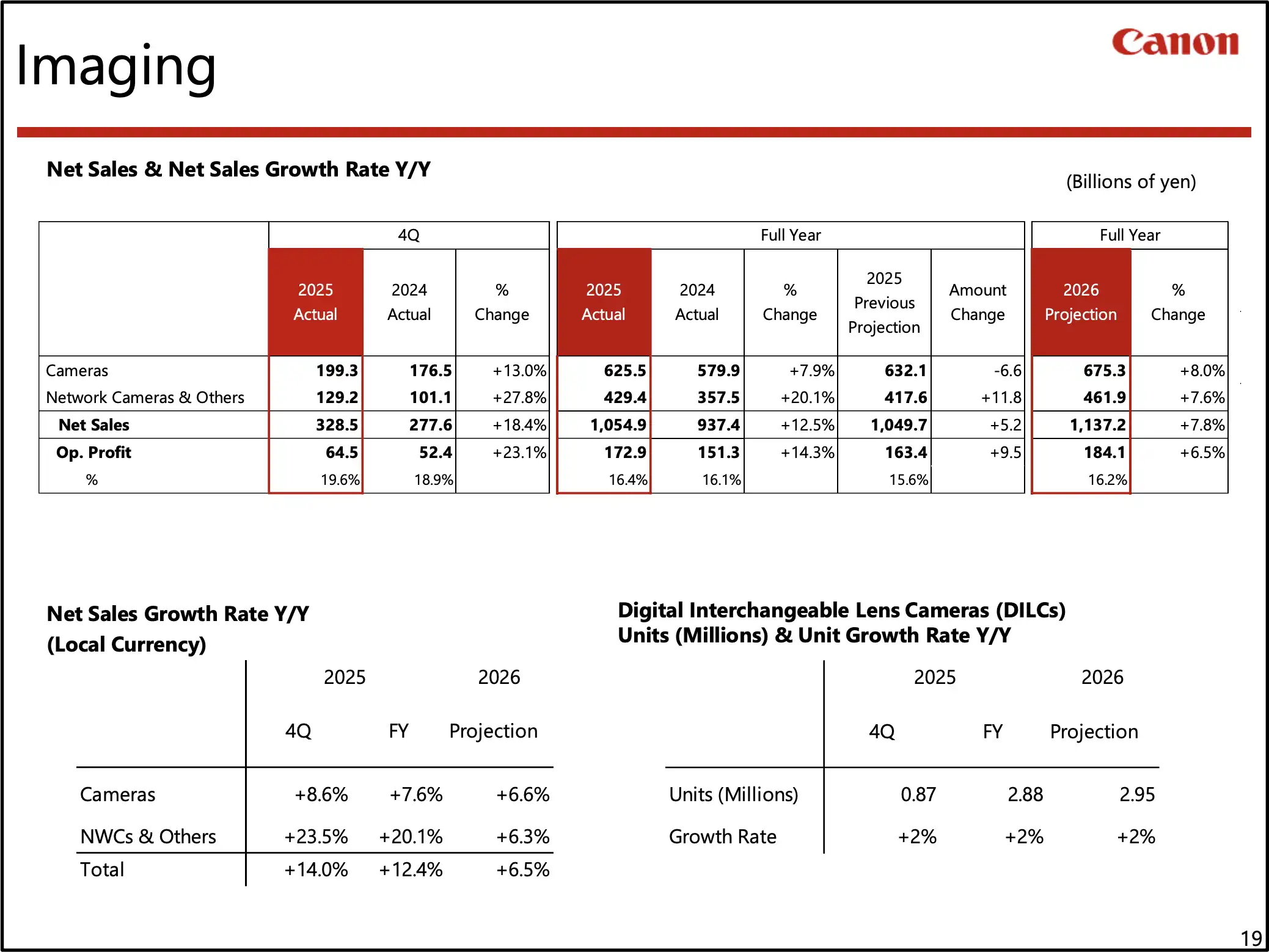 Canon’s Imaging business includes the Cameras category plus Network Cameras & Others. For FY2025: